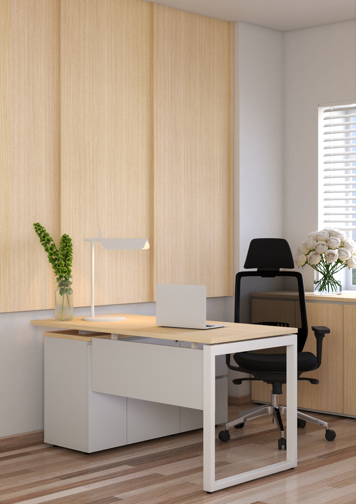 L-shaped corner desks connected with low side cabinets are commonly used as management desks. The desk design with a long cabinet section creates a spacious, convenient L-shaped corner, maximizing storage area and workspace. The cabinet section with a structure of 3 drawers and 2 wide doors can conveniently store documents, laptops, and personal items.
