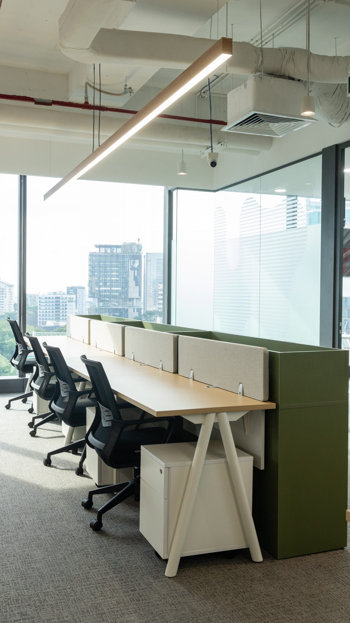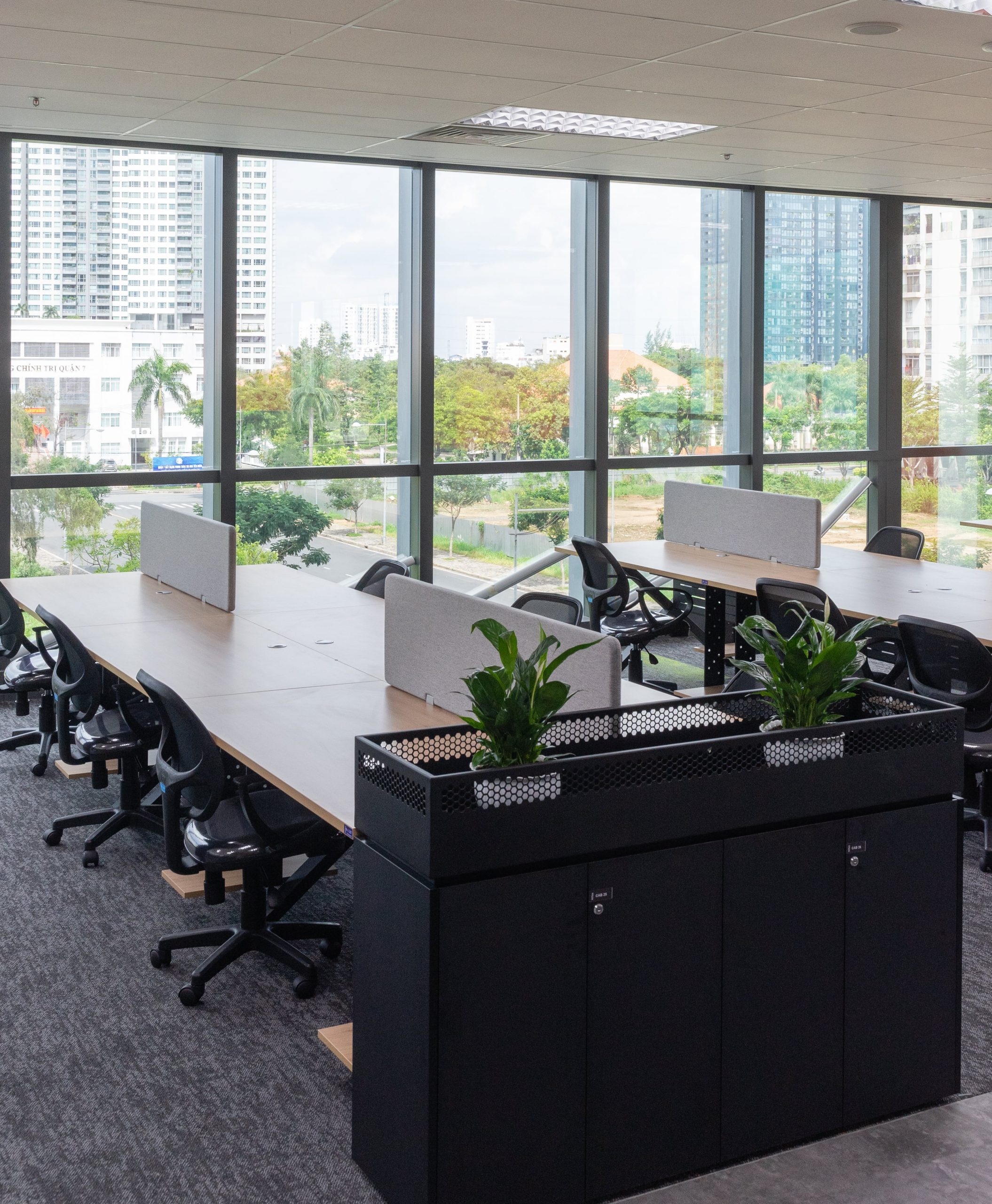 Row desks with simple design combined with screen accessories and mobile cabinets, CPU shelves create private work corners for each individual while still ensuring design unity for the space.