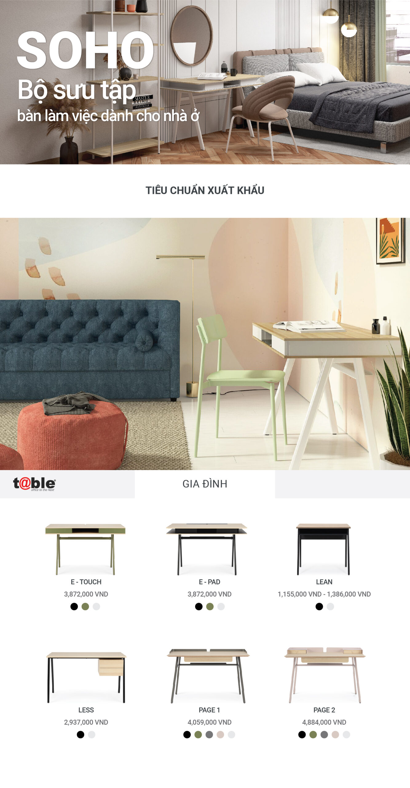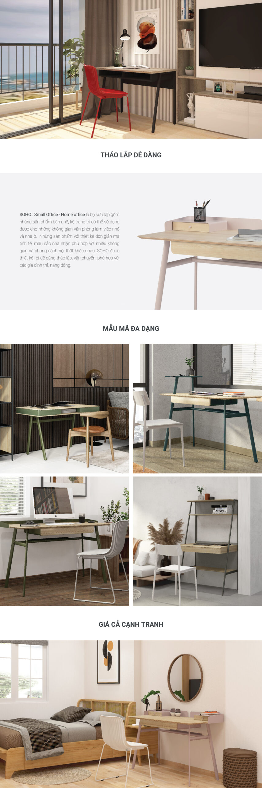 The SOHO product collection is suitable for many users, easy to apply in many interior spaces. The assembly design helps users easily use, pack and transport when needed.