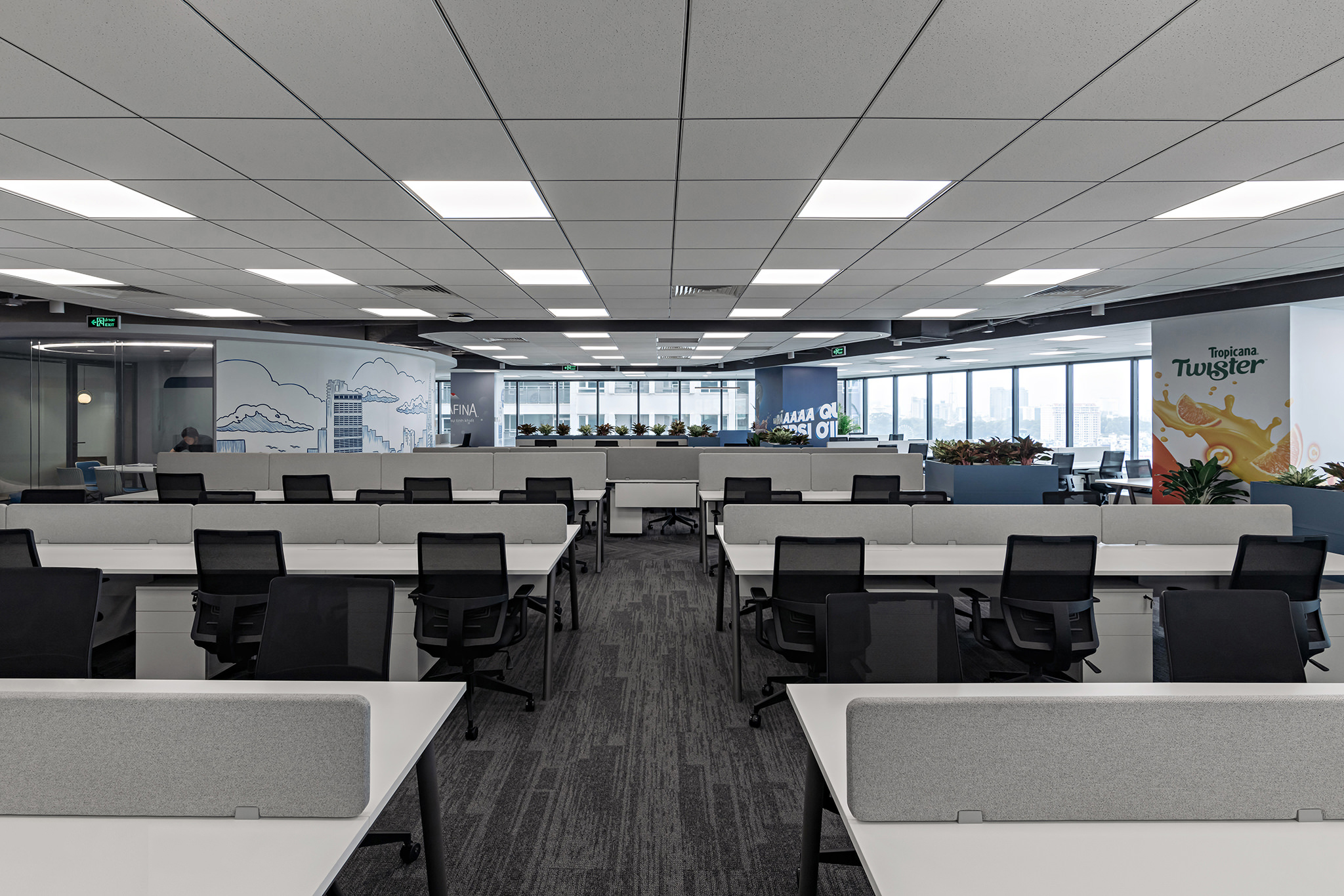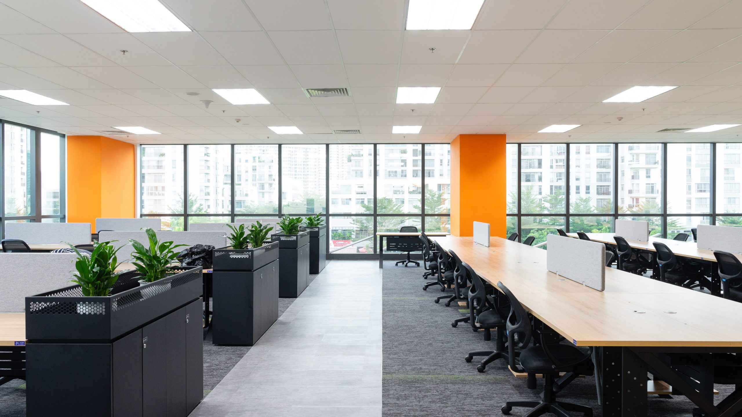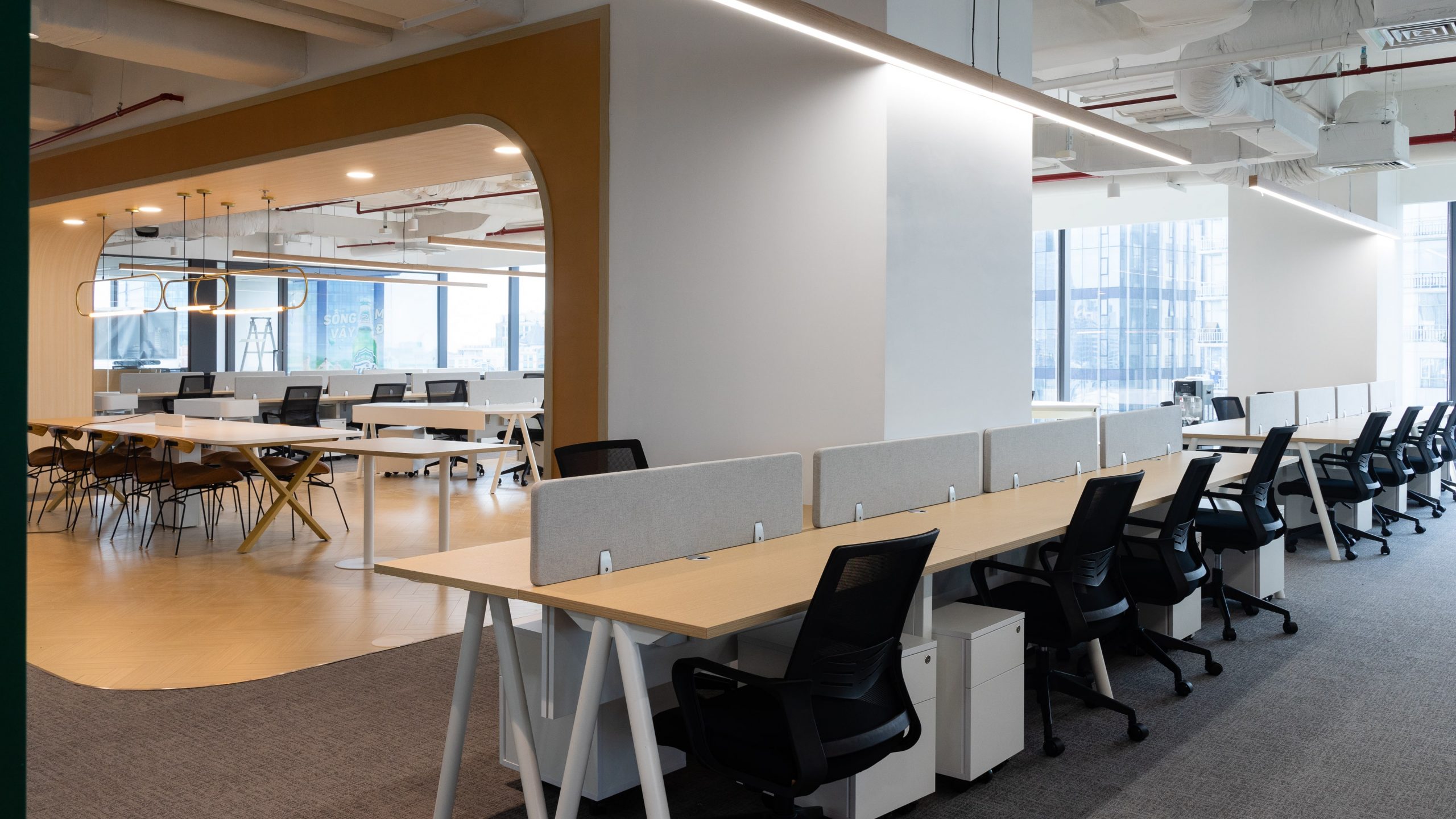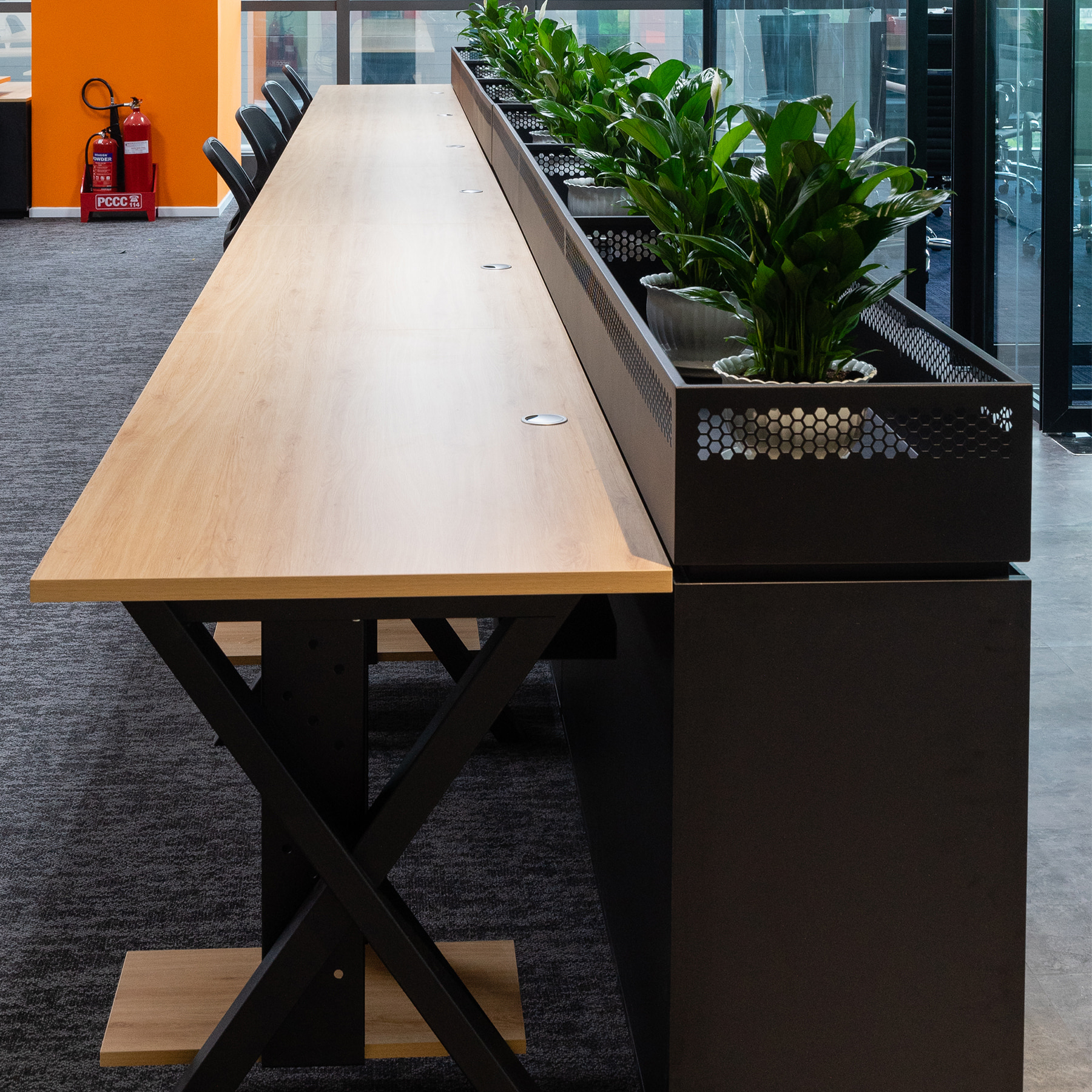 Bàn dãy thiế kế đơn giản kết hợp với phụ kiện tấm che và tủ di động, tủ kệ CPU tạo thành các góc làm việc riêng tư cho mỗi cá nhân nhưng vẫn đảm bảo tính thống nhất về mặt thiết kế cho không gian.