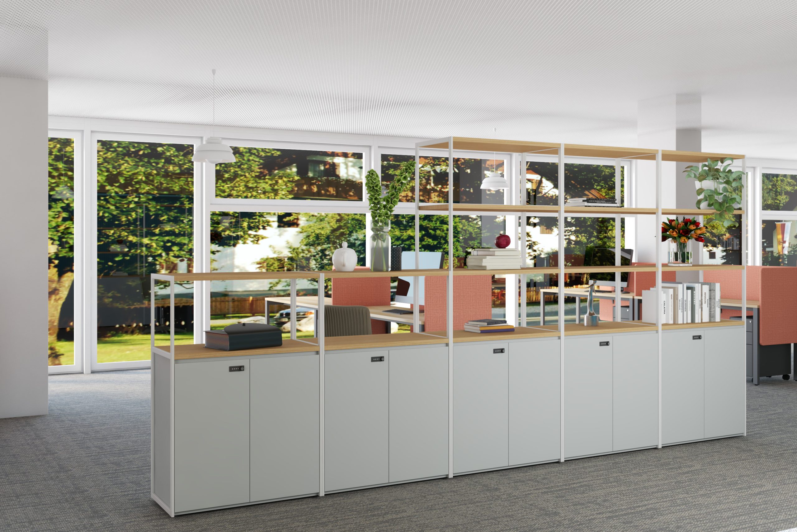 Đây là giải pháp lưu trữ hữu ích cho những văn phòng không có nhiều không gian cho tủ hồ. Với thiết kế tủ đặt kế bên mỗi cụm bàn và nhỏ gọn, không tốn nhiều diện tích, đem lại sự tiện dụng và thẩm mỹ cho không gian. Bạn có thể lựa chọn kiểu tủ không cánh để trưng bày các vật như chậu cây, sách hay đồ trang trí. Hoặc bạn cũng có thể lựa chọn tủ có cánh kết hợp tủ cây bên trên để giúp mọi thứ ngăn nắp, tăng thẩm mỹ cho văn phòng.